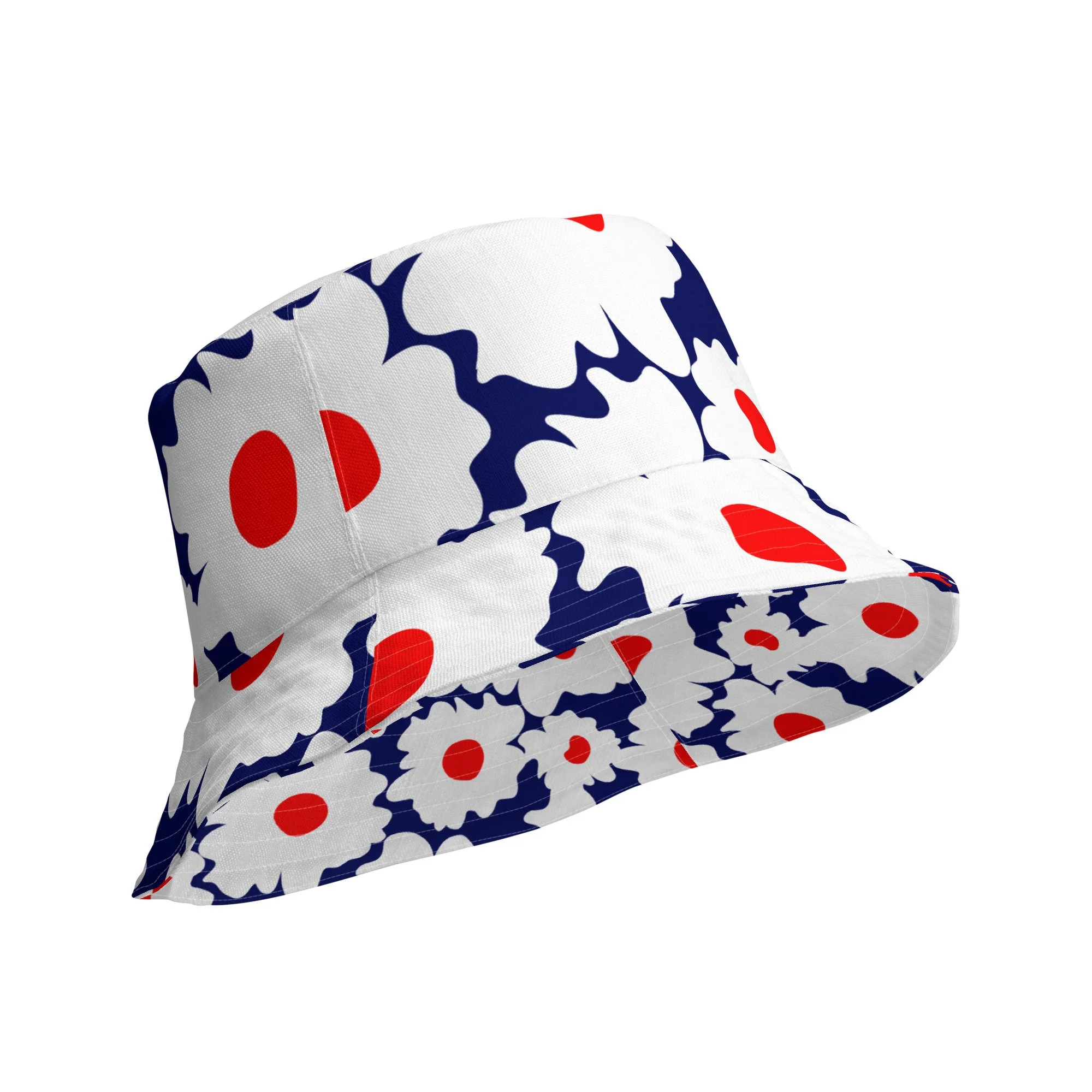 Reversible Bucket Hat Red, White And Navy Blue Abstract Flower Pattern