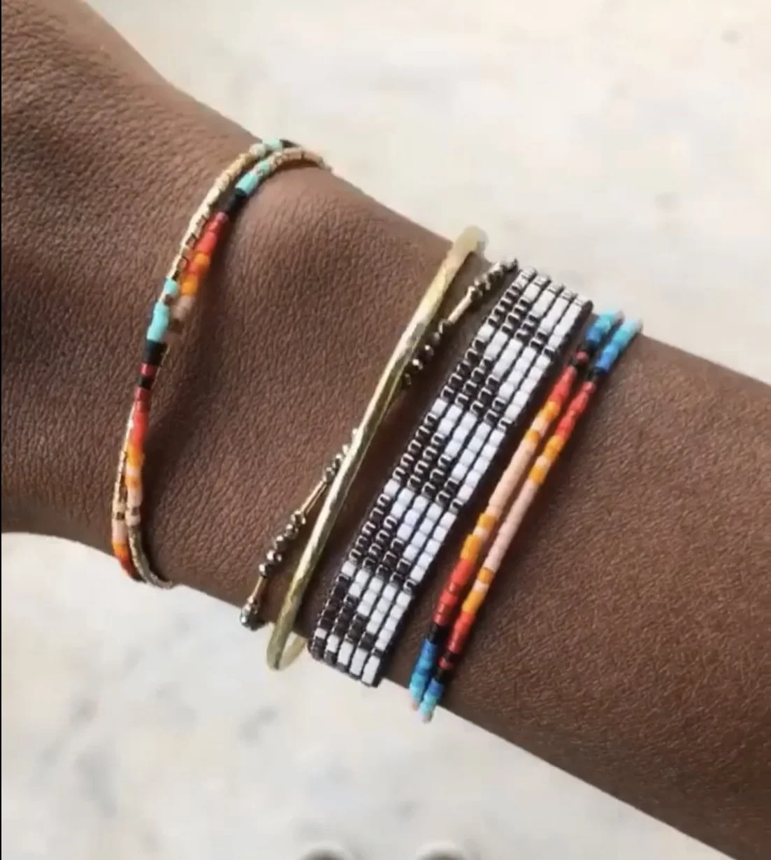 Quirky and cute, stackable bracelet, with colorful Island-themed patterning and golden beads interspersed throughout.